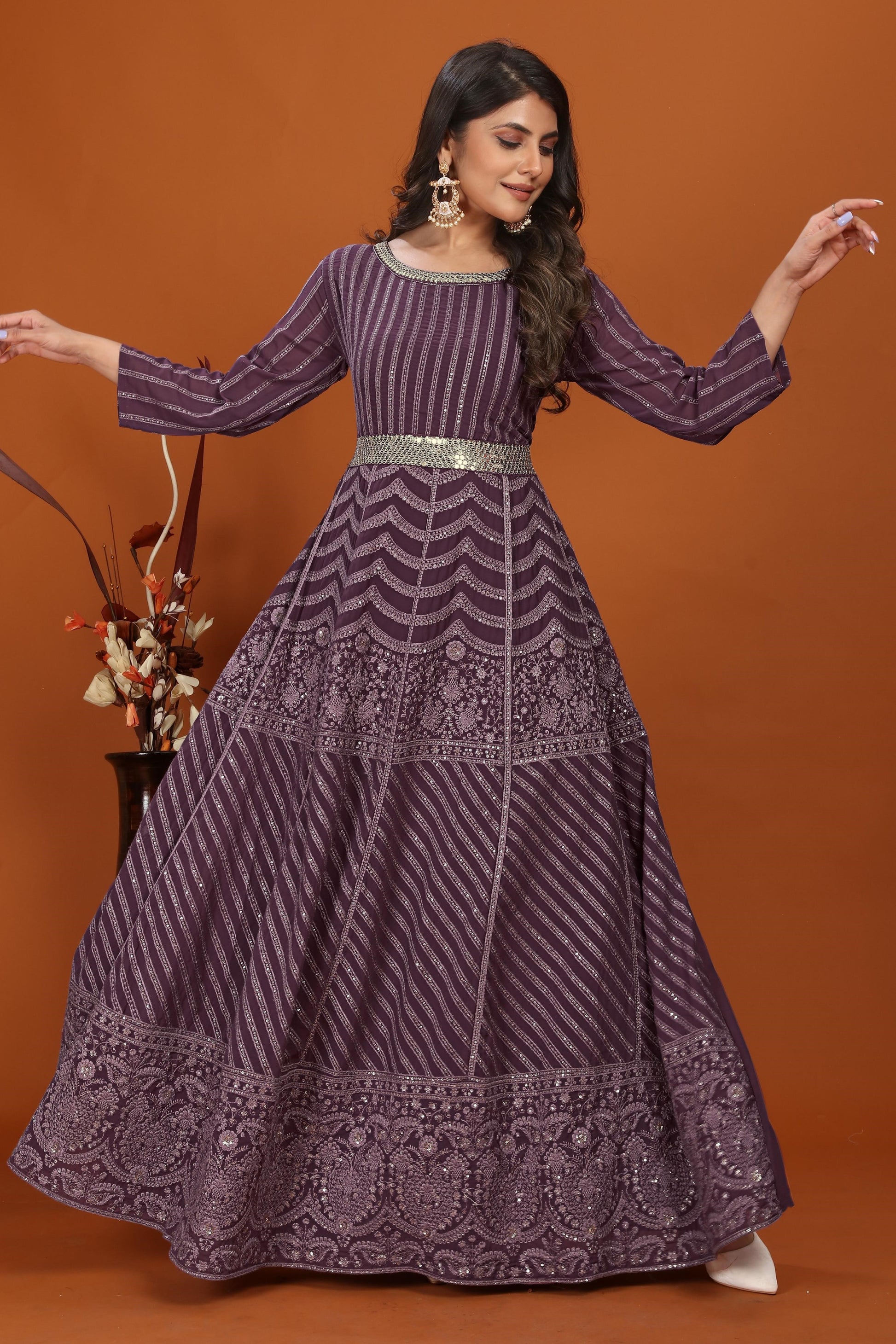 Wine Faux Georgette Embroidered Long Anarkali Suit