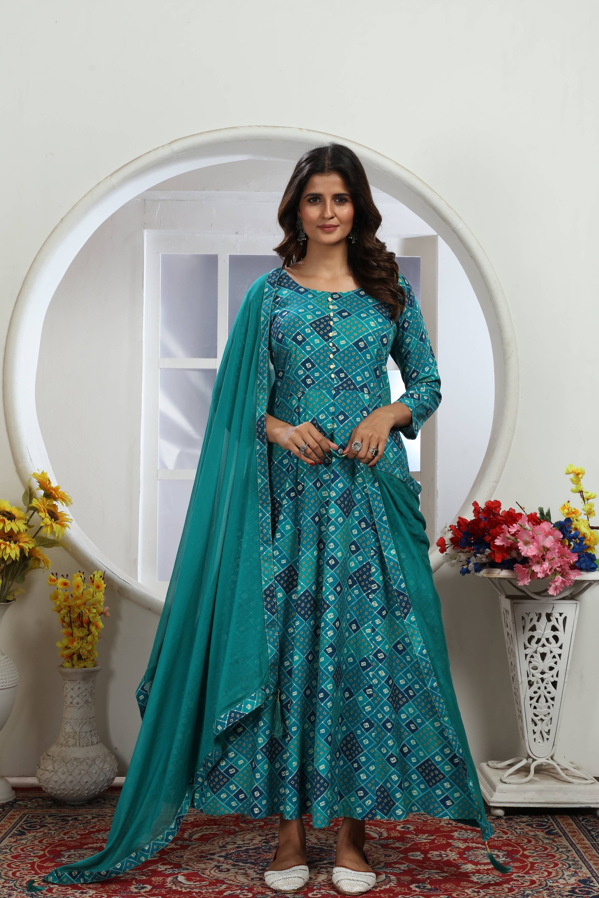 Turquoise Bandhani Foil Printed Rayon Long Kurti